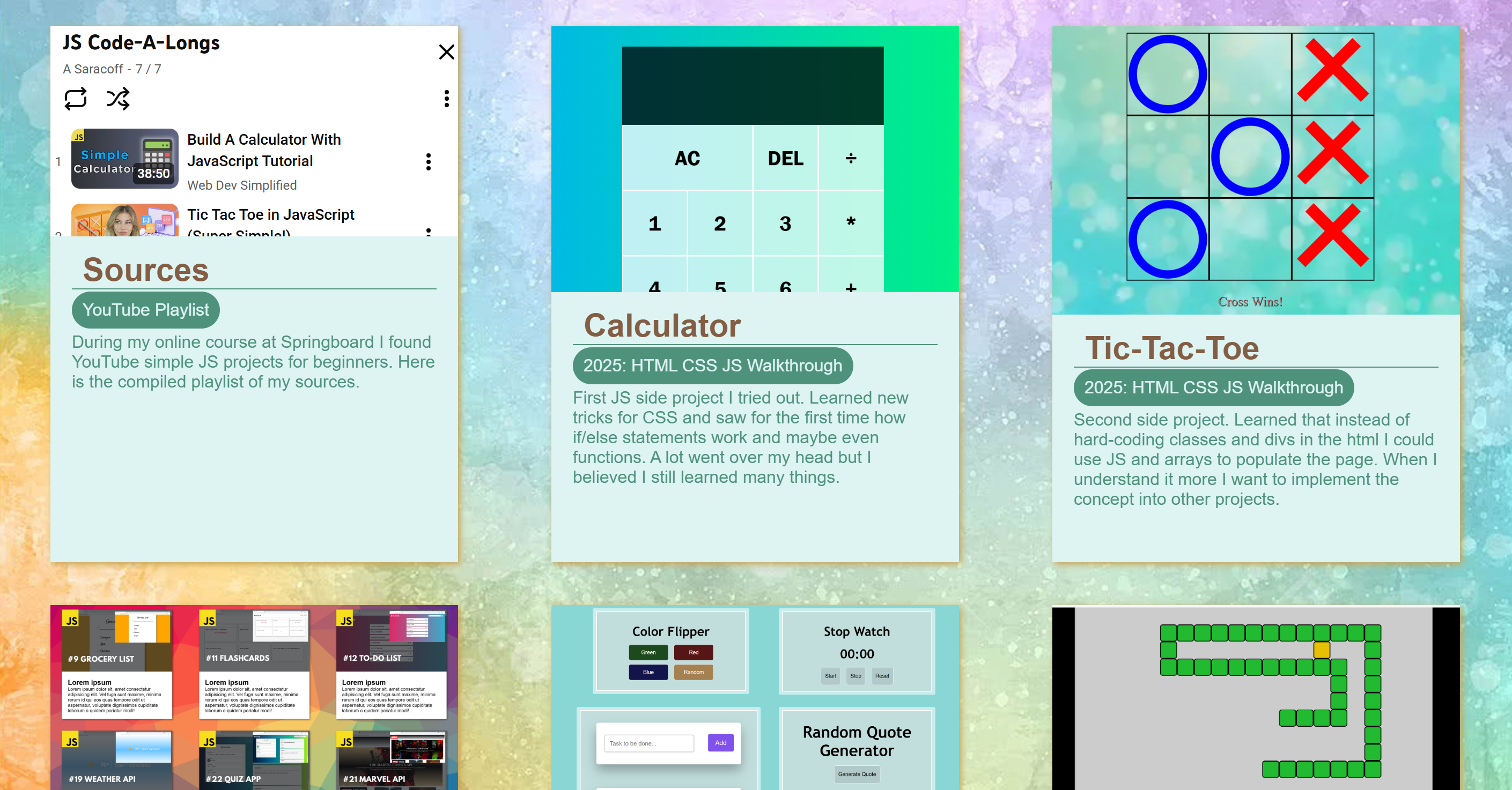 - Side Projects: Walkthroughs found on YouTube that I followed to better understand what was being taught in class